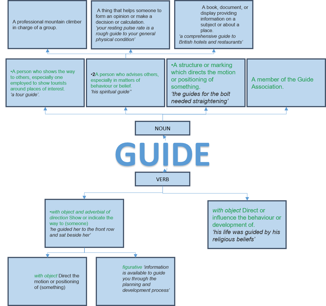 3. I had watched the theme revelation video before tackling this stage, but I hadn’t noticed the attached papers that explained the use of VNA (Verb, Non, Adjective) cards. I have since read them (but not until after I had completed the Associations and Links stage) and I now realise that “GUIDE” must be used as a verb, and so I might have wasted some time arranging and considering the definitions and examples of “Guide” used as a noun. I could have saved some, if not all of the excess time by ignoring them. Looking at it from a different angle though, a guide, is used to guide. The two are practically interchangeable, and so, it could be argued that exploring “GUIDE” as a noun was time well spent.